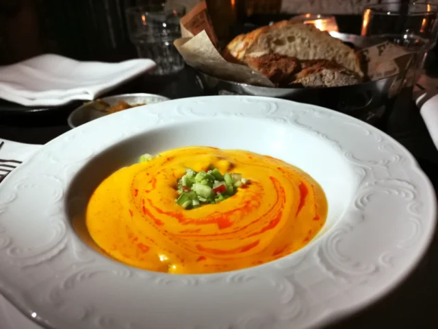 לצידו הזמנו גספצ'יו מנגו בגרסתו נטולת השרימפס החלוטים (38/68 ש"ח בהתאם) עם עגבניות צהובות, מנגו מאיה, נקטרינה, פאקוס, שאלוט, שמן צ'ילי ופטרוזיליה. הגספצ'ו היה חרפרף במידה ומרענן במיוחד, המנגו העניק מתיקות קלילה והפאקוס רענן ואיזן את שאר המרכיבים.