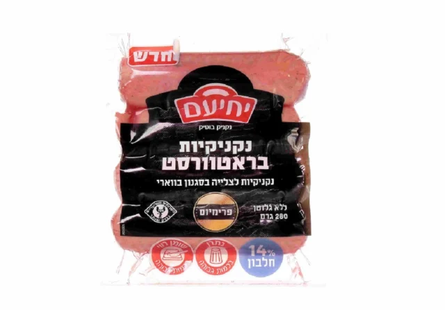 נקניקיות בראטוורסט של מעדני יחיעם | מחיר מומלץ לצרכן: 19-23 ש"ח לאריזת 280 גרם | להשיג ברשתות השיווק ובחנויות המובחרות ברחבי הארץ
