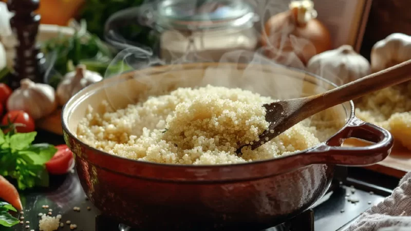 - כשהקינואה מוכנה, ערבבו אותה מעט עם מזלג, כסו ותנו לה לנוח למשך 5 דקות בטרם ההגשה.