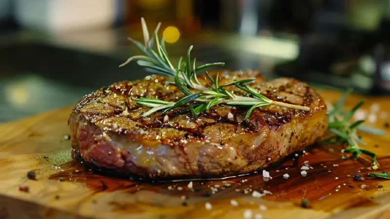 לאחר שהסטייק הגיע לדרגת הבישול הרצויה, הוציאו אותו מהמחבת והניחו על צלחת רחבה, הניחו מעליו את הרוזמרין מהמחבת. הניחו לסטייק לנוח במצב הזה לפחות 5 דקות ורק אז העבירו אותו לקרש חיתוך עבה מעץ.