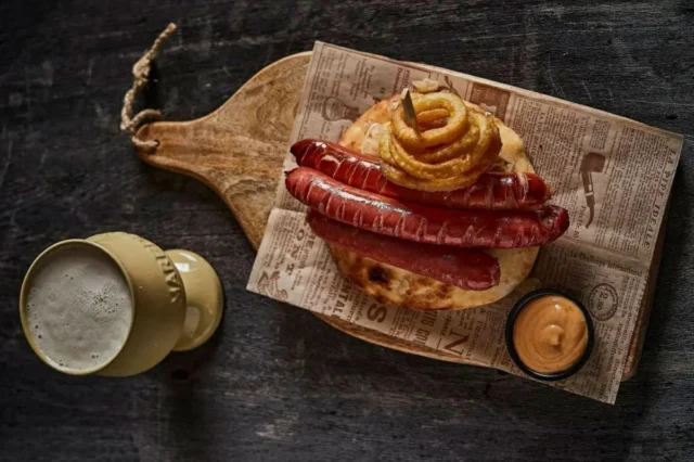 לצד הבירה יוגשו מנות שהולכות מעולה ליד הבירה כמו נקניקיית ענק באורך חצי מטר לחלוקה עם חברים, המבורגר רב-קומות, פיש אנד צ'יפס ועוד.
