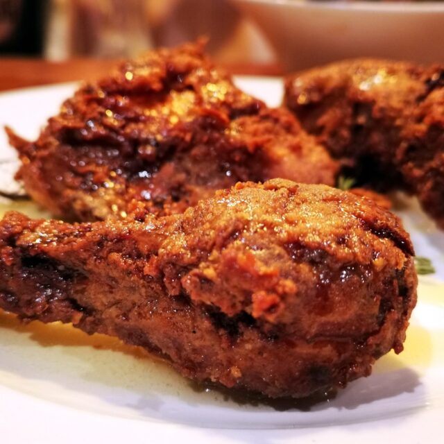 כחובבים מושבעים של עוף מטוגן על כל צורותיו, לא חשבנו פעמיים ומיהרנו לתפוס מקום על הבר רגע לפני שההזמנות לערב נסגרו. נכנסנו בסביבות השעה תשע ורבע אל המסעדה וחלפנו על פני האורחים הרבים שזללו את העוף בהנאה, בידיים כמובן, כמו שאלוהים התכוון.
