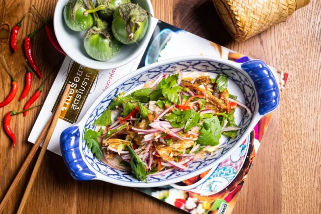 תמצאו בה יאם סאי הואה – נקניקייה צלויה מצ'אנג מאי על סלט פלפלים חריפים ובצל סגול; יאם פלה הנג – מליטות מיובשות ופריכות בסלט עם בצל, סלרי ופלפלים חריפים; פאק בונג מו קרופ – מורנינג גלורי עם פרוסות ברוסט פריכות, תאו תייאו ופלפלים חריפים ופלה פאד פיקנג – נתחי לברק מטוגנים ומוקפצים בקארי אדום, פלפלים חריפים, בזיל תאי וירק עונתי (חציל תאי/לוביה/אפונת שלג).